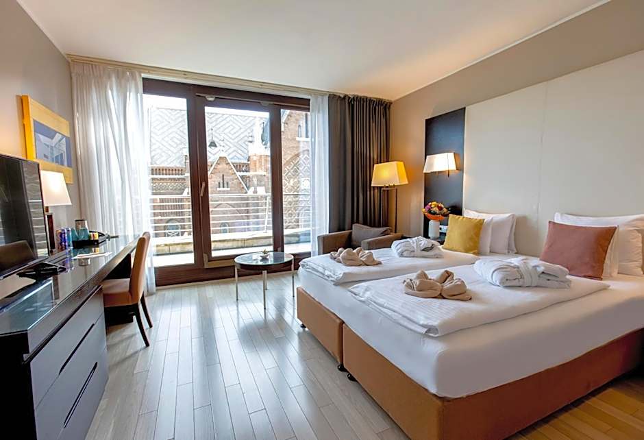 This bright and spacious double room features a work desk, free Wi-Fi, capsule coffee/tea machine, daily mineral water and snack, ironing set, bathrobes & slippers. It also provides access to the business lounge with unlimited all day refreshments.